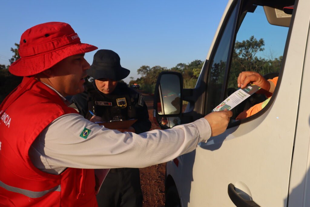 As ações se estenderam à MS-377 com a realização de uma blitz educativa, também em parceria com a BPMRv. Durante as abordagens, foram repassadas orientações e distribuídos materiais informativos a motoristas de diferentes perfis, incluindo profissionais do projeto, condutores de outras empresas e usuários da rodovia.
