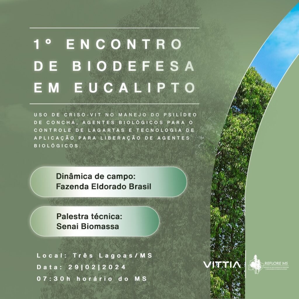 Reflore-MS e VITTIA promovem 1° Encontro de Biodefesa em Eucalipto em Três LagoasEvento é gratuito e conta com prática de campo e palestra; as vagas são limitadas A Reflore-MS, Associação Sul-Mato-Grossense de Produtores e Consumidores de Florestas Plantadas, em parceria com a empresa VITTIA, promoverá o1° Encontro de Biodefesa em Eucalipto. O evento será realizado […]